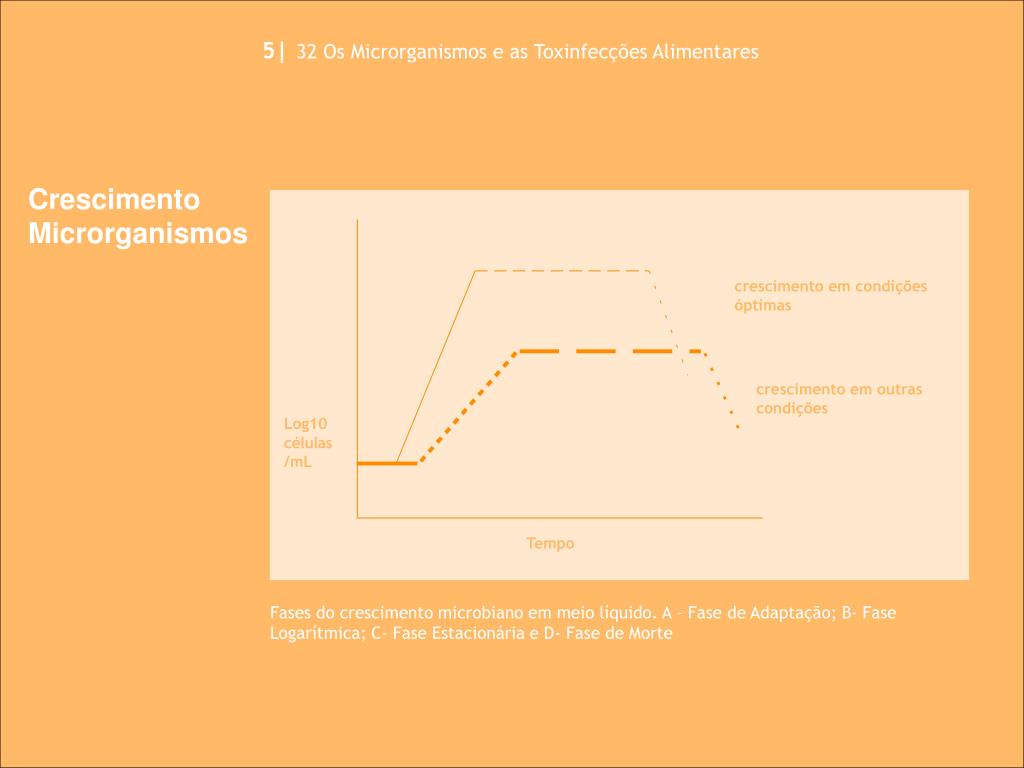 5|32 Os Microrganismos e as Toxinfecções Alimentares Crescimento Microrganismos Fases do crescimento microbiano em meio líquido. A – Fase de Adaptação; B- Fase Logarítmica; C- Fase Estacionária e D- Fase de Morte