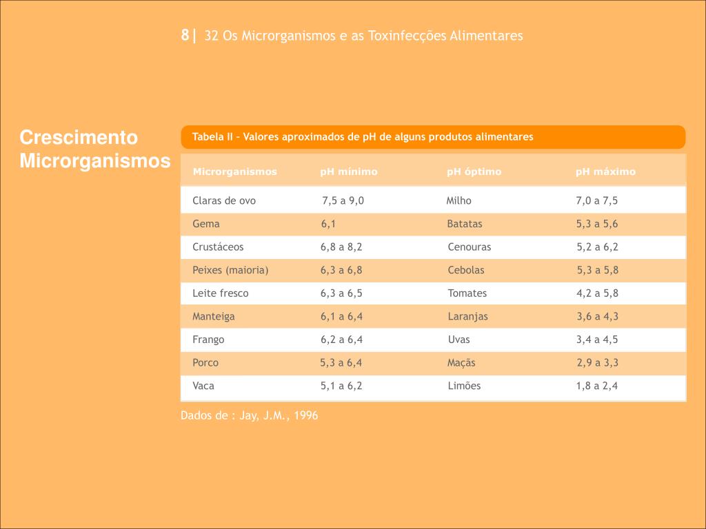 7|32 Os Microrganismos e as Toxinfecções Alimentares Crescimento Microrganismos Dados de : Jay, J.M., 1996