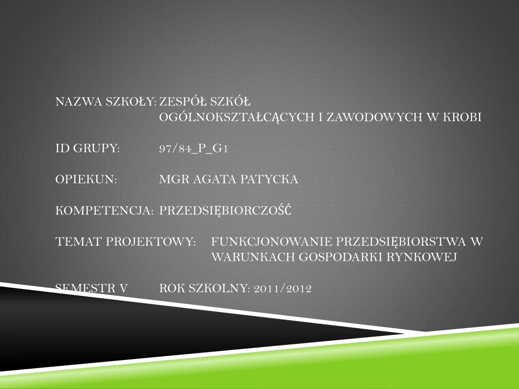 Nazwa szkoły: Zespół Szkół Ogólnokształcących i Zawodowych w KrobiID grupy: 97/84_P_G1Opiekun: mgr Agata PatyckaKompetencja: PrzedsiębiorczośćTemat projektowy: Funkcjonowanie przedsiębiorstwa w warunkach gospodarki rynkowejSemestr V Rok szkolny: 2011/2012