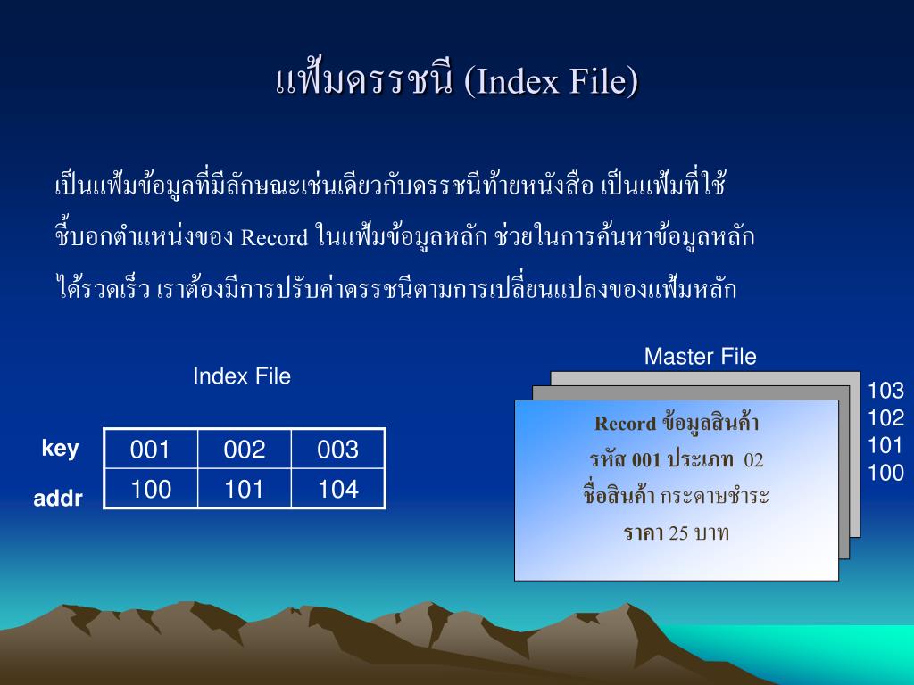 Record ข้อมูลสินค้า รหัส 001 ประเภท02 ชื่อสินค้า กระดาษชำระ ราคา 25 บาท แฟ้มดรรชนี (Index File) เป็นแฟ้มข้อมูลที่มีลักษณะเช่นเดียวกับดรรชนีท้ายหนังสือ เป็นแฟ้มที่ใช้ ชี้บอกตำแหน่งของ Record ในแฟ้มข้อมูลหลัก ช่วยในการค้นหาข้อมูลหลัก ได้รวดเร็ว เราต้องมีการปรับค่าดรรชนีตามการเปลี่ยนแปลงของแฟ้มหลัก Master File Index File 103 102 101 100 key addr