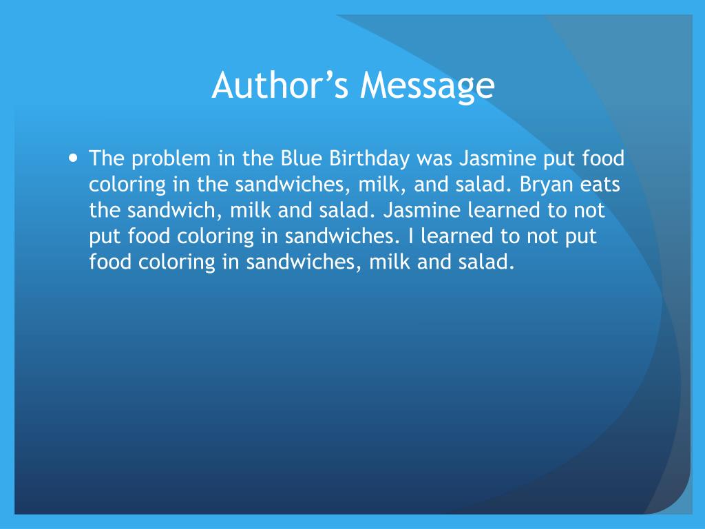 Author’s Message • The problem in the Blue Birthday was Jasmine put food coloring in the sandwiches, milk, and salad. Bryan eats the sandwich, milk and salad. Jasmine learned to not put food coloring in sandwiches. I learned to not put food coloring in sandwiches, milk and salad.