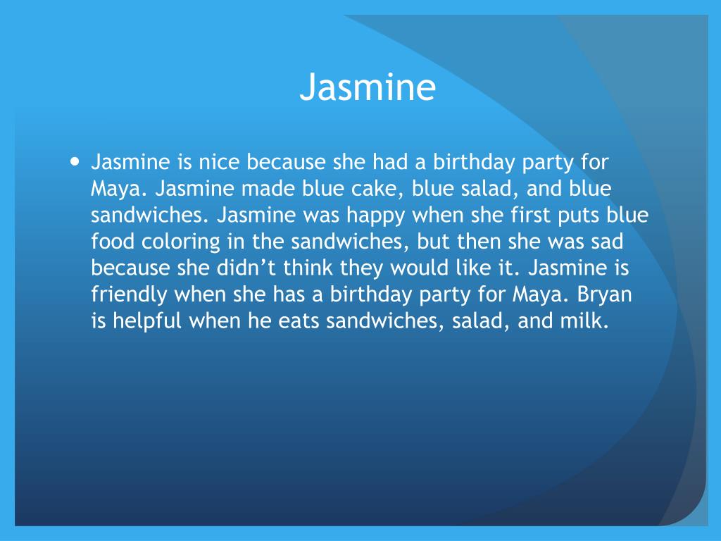 Jasmine • Jasmine is nice because she had a birthday party for Maya. Jasmine made blue cake, blue salad, and blue sandwiches. Jasmine was happy when she first puts blue food coloring in the sandwiches, but then she was sad because she didn’t think they would like it. Jasmine is friendly when she has a birthday party for Maya. Bryan is helpful when he eats sandwiches, salad, and milk.