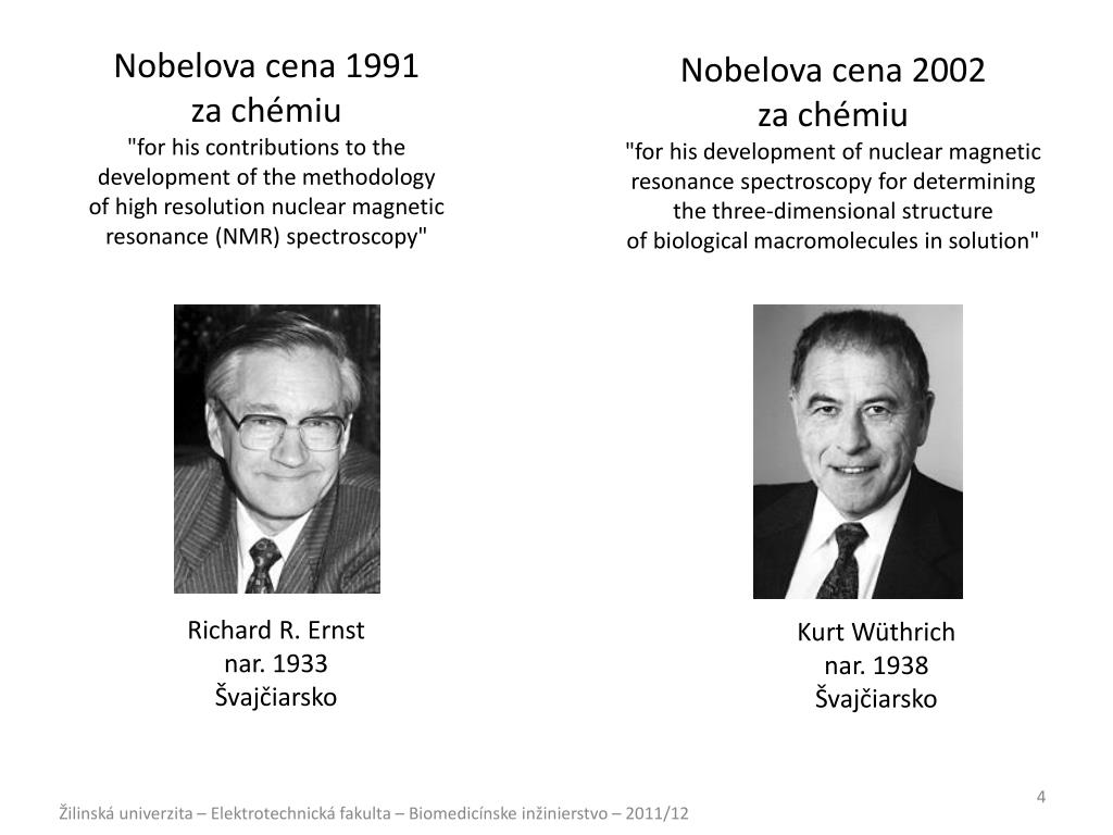 Nobelova cena 1991 za chémiu"for his contributions to thedevelopmentofthemethodologyofhighresolutionnuclearmagnetic resonance (NMR) spectroscopy" Nobelova cena 2002 za chémiu"for his development of nuclear magnetic resonance spectroscopy for determining the three-dimensional structure of biological macromolecules in solution" Richard R. Ernst nar. 1933 Švajčiarsko Kurt Wüthrich nar. 1938 Švajčiarsko • Žilinská univerzita – Elektrotechnická fakulta – Biomedicínske inžinierstvo –2011/12