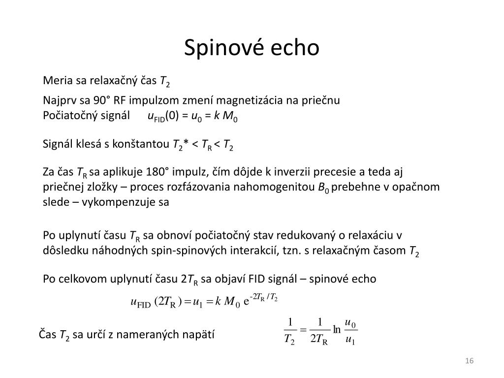 Spinové echo Meria sa relaxačný čas T2 Najprv sa 90° RF impulzom zmení magnetizácia na priečnu Počiatočný signál uFID(0) = u0 = k M0 Signál klesá s konštantou T2* < TR < T2 Za čas TR sa aplikuje 180° impulz, čím dôjde k inverzii precesie a teda aj priečnej zložky – proces rozfázovanianahomogenitouB0 prebehne v opačnom slede – vykompenzuje sa Po uplynutí času TR sa obnoví počiatočný stav redukovaný o relaxáciu v dôsledku náhodných spin-spinových interakcií, tzn. s relaxačným časom T2 Po celkovom uplynutí času 2TR sa objaví FID signál – spinové echo Čas T2 sa určí z nameraných napätí
