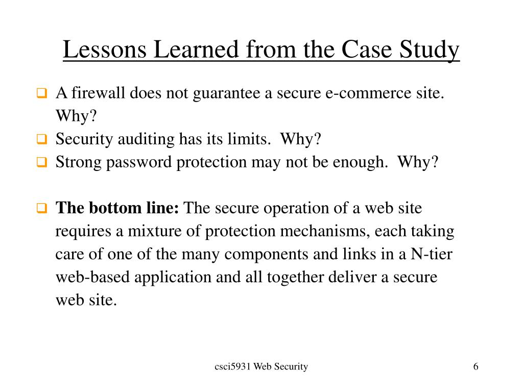 Lessons Learned from the Case Study • A firewall does not guarantee a secure e-commerce site. Why? • Security auditing has its limits. Why? • Strong password protection may not be enough. Why? • The bottom line: The secure operation of a web site requires a mixture of protection mechanisms, each taking care of one of the many components and links in a N-tier web-based application and all together deliver a secure web site. csci5931 Web Security