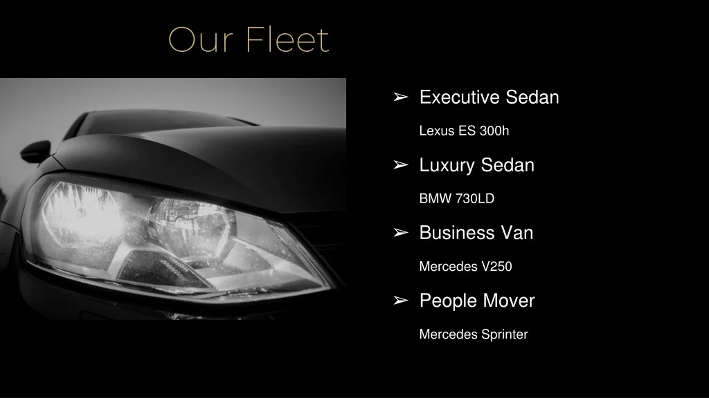 Our Fleet Executive Sedan Lexus ES 300h Luxury Sedan BMW 730LD Business Van Mercedes V250 People Mover Mercedes Sprinter