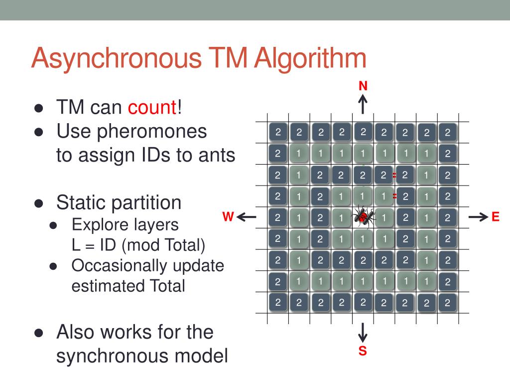 Asynchronous TM Algorithm N • TM can count! • Use pheromonestoassign IDs to ants • Static partition • Explore layersL = ID (mod Total) • Occasionally updateestimated Total • Also works for thesynchronous model 2 2 2 2 2 2 2 2 2 1 1 1 1 1 1 1 2 2 ID = 2 2 2 2 1 2 1 2 2 2 ID = 1 1 1 2 2 1 2 1 1 2 2 2 2 2 1 1 1 1 E W 2 2 1 2 1 2 1 1 1 2 2 2 2 2 2 1 2 1 1 1 1 1 1 1 1 2 2 2 2 2 2 2 2 2 2 2 S