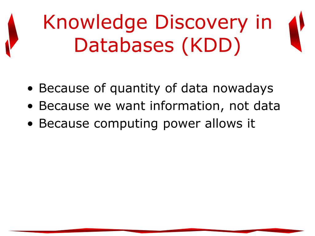 Knowledge Discovery in Databases (KDD) • Because of quantity of data nowadays • Because we want information, not data • Because computing power allows it