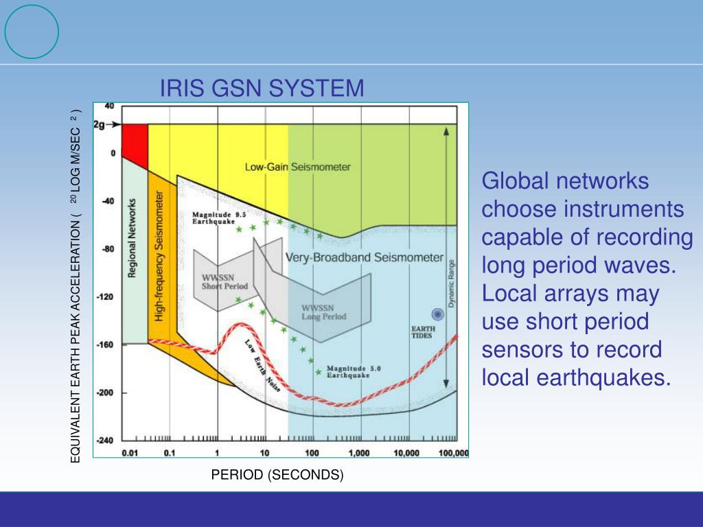 EQUIVALENT EARTH PEAK ACCELERATION ( 20 LOG M/SEC 2 ) PERIOD (SECONDS) IRIS GSN SYSTEM Global networks choose instruments capable of recording long period waves. Local arrays may use short period sensors to record local earthquakes.