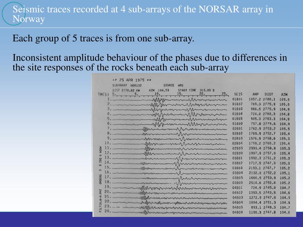 Seismic traces recorded at 4 sub-arrays of the NORSAR array in Norway Each group of 5 traces is from one sub-array. Inconsistent amplitude behaviour of the phases due to differences in the site responses of the rocks beneath each sub-array