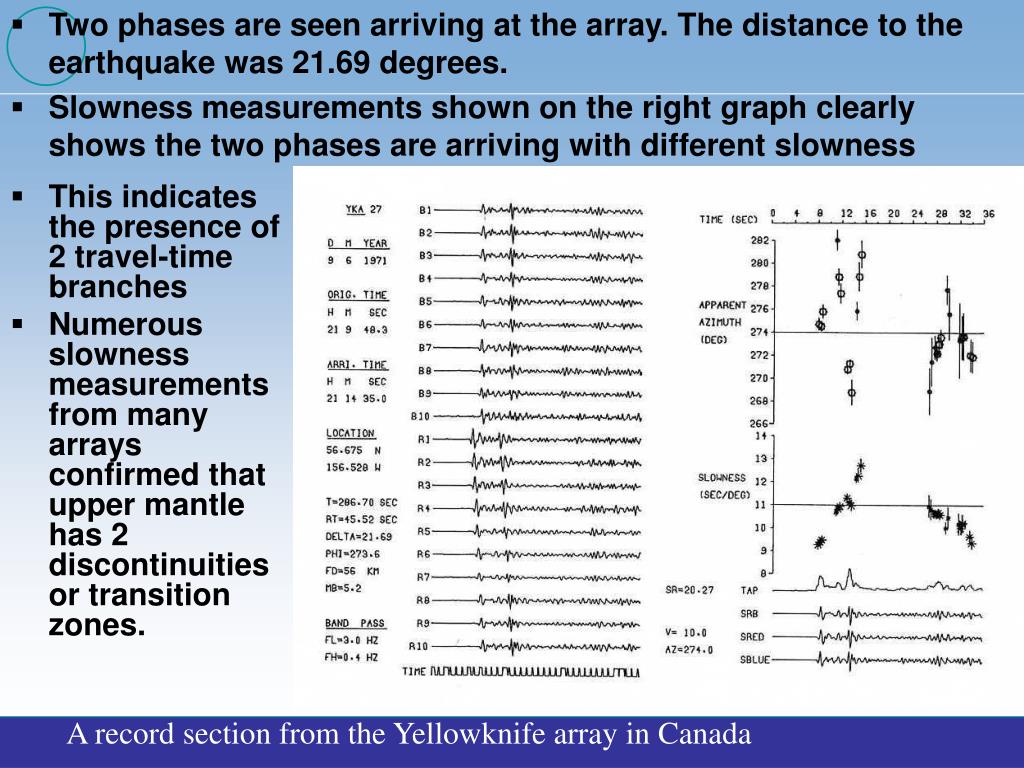 This indicates the presence of 2 travel-time branches • Numerous slowness measurements from many arrays confirmed that upper mantle has 2 discontinuities or transition zones. • Two phases are seen arriving at the array. The distance to the earthquake was 21.69 degrees. • Slowness measurements shown on the right graph clearly shows the two phases are arriving with different slowness A record section from the Yellowknife array in Canada
