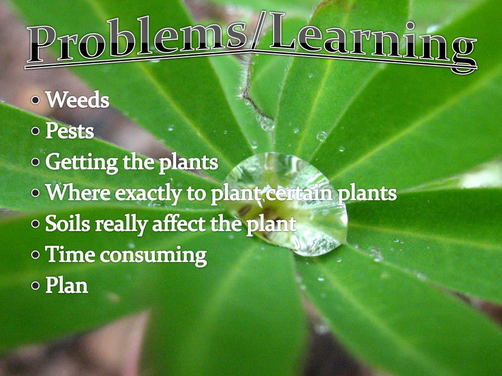 Problems/Learning • Weeds • Pests • Getting the plants • Where exactly to plant certain plants • Soils really affect the plant • Time consuming • Plan