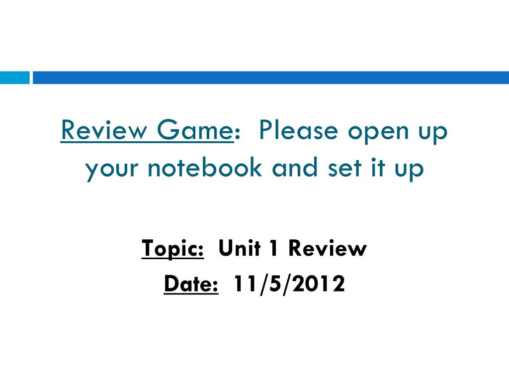 Review Game: Please open up your notebook and set it up Topic: Unit 1 Review Date:11/5/2012