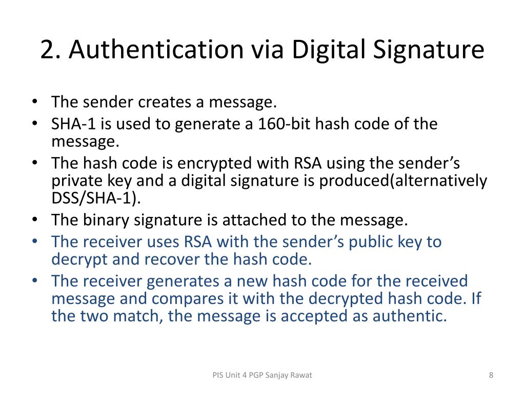 2. Authentication via Digital Signature • The sender creates a message. • SHA-1 is used to generate a 160-bit hash code of the message. • The hash code is encrypted with RSA using the sender’s private key and a digital signature is produced(alternatively DSS/SHA-1). • The binary signature is attached to the message. • The receiver uses RSA with the sender’s public key to decrypt and recover the hash code. • The receiver generates a new hash code for the received message and compares it with the decrypted hash code. If the two match, the message is accepted as authentic. PIS Unit 4 PGP Sanjay Rawat
