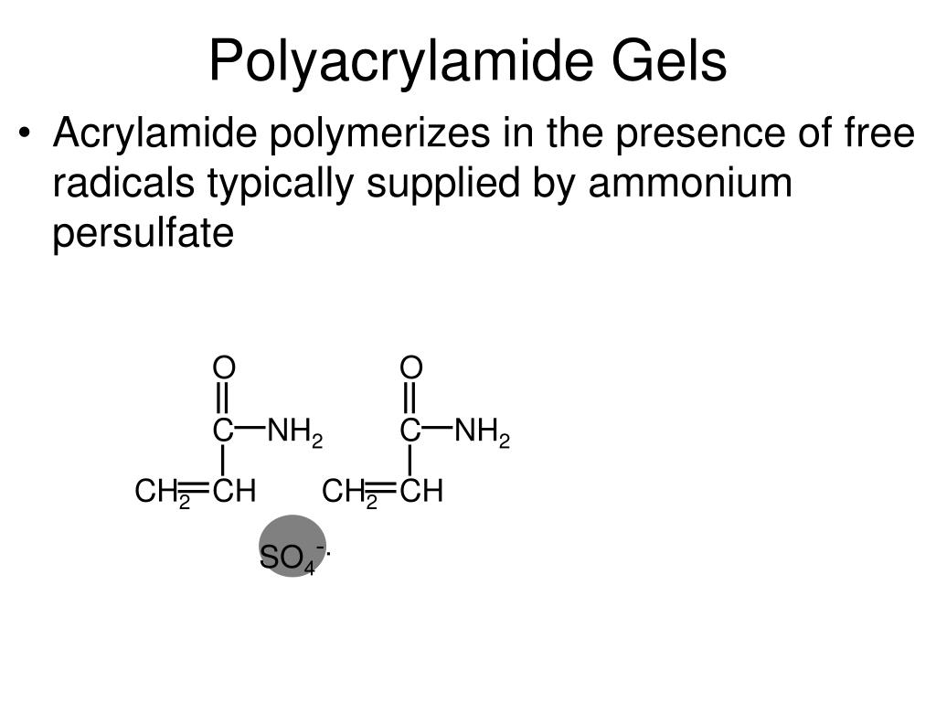 O O C C NH2 NH2 CH2 CH2 CH CH SO4-. Polyacrylamide Gels • Acrylamide polymerizes in the presence of free radicals typically supplied by ammonium persulfate