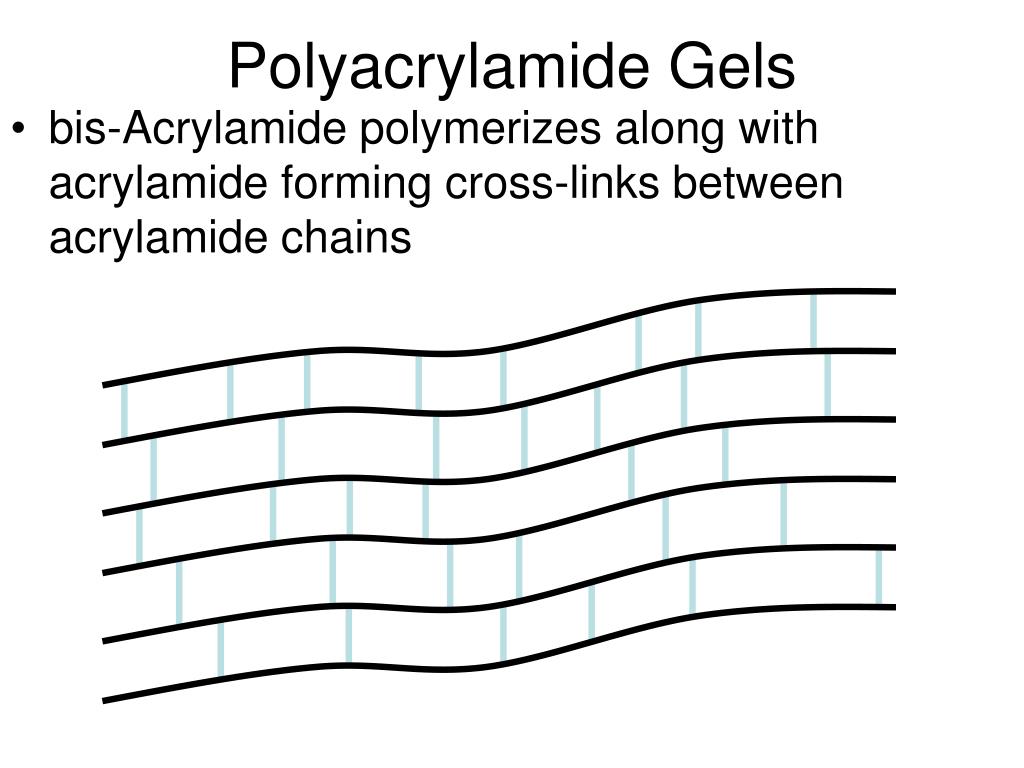 Polyacrylamide Gels • bis-Acrylamide polymerizes along with acrylamide forming cross-links between acrylamide chains
