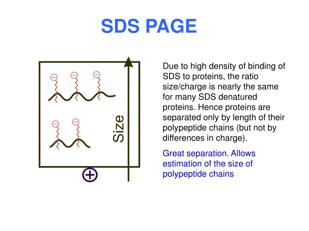 SDS PAGE Due to high density of binding of SDS to proteins, the ratio size/charge is nearly the same for many SDS denatured proteins. Hence proteins are separated only by length of their polypeptide chains (but not by differences in charge). Great separation. Allows estimation of the size of polypeptide chains