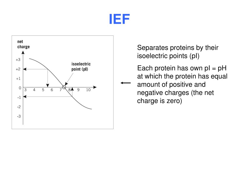 IEF Separates proteins by their isoelectric points (pI) Each protein has own pI = pH at which the protein has equal amount of positive and negative charges (the net charge is zero)