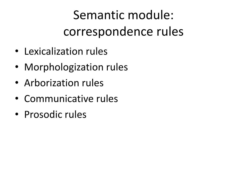 Semantic module:correspondencerules • Lexicalizationrules • Morphologizationrules • Arborizationrules • Communicative rules • Prosodicrules