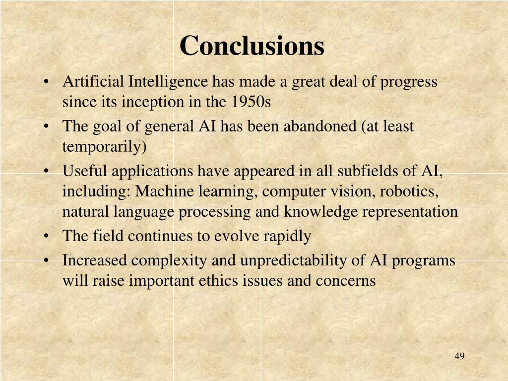 Conclusions • Artificial Intelligence has made a great deal of progress since its inception in the 1950s • The goal of general AI has been abandoned (at least temporarily)