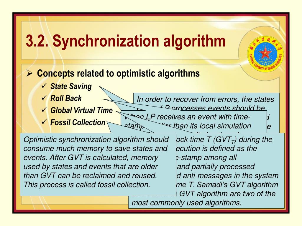 3.2. Synchronization algorithm • Concepts related to optimistic algorithms • State Saving • Roll Back • Global Virtual Time • Fossil Collection In order to recover from errors, the states before LP processes events should be saved. There are some commonly used methods for state saving, such as whole state saving, periodic state saving, incremental state saving and reverse computation. When LP receives an event with time-stamp smaller than its local simulation clock (this event is called a straggler event), it should restore its state and send anti-message to cancel the event sent earlier. This process is called roll back. Optimistic synchronization algorithm should consume much memory to save states and events. After GVT is calculated, memory used by states and events that are older than GVT can be reclaimed and reused. This process is called fossil collection. GVT at wallclock time T (GVTT) during the simulation execution is defined as the minimum time-stamp among all unprocessed and partially processed messages and anti-messages in the system at wallclock time T. Samadi’s GVT algorithm and Mattern’s GVT algorithm are two of the most commonly used algorithms.