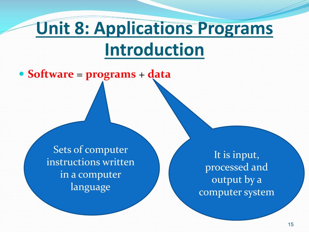 Unit 8: Applications ProgramsIntroduction • Software = programs + data Sets of computer instructions written in a computer language It is input, processed and output by a computer system
