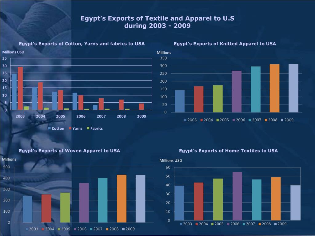 Egypt’s Exports of Textile and Apparel to U.S during 2003 - 2009 Egypt’s Exports of Cotton, Yarns and fabrics to USA Egypt’s Exports of Knitted Apparel to USA Egypt’s Exports of Woven Apparel to USA Egypt’s Exports of Home Textiles to USA