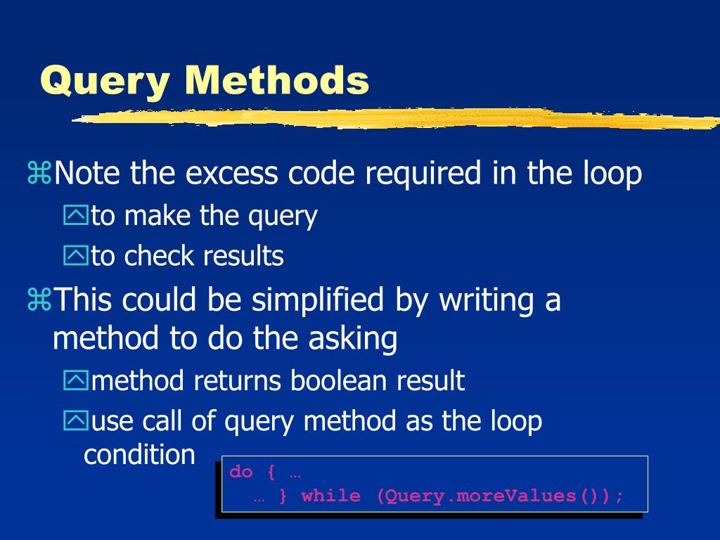 Query Methods • Note the excess code required in the loop • to make the query • to check results • This could be simplified by writing a method to do the asking • method returns boolean result • use call of query method as the loop condition do { … … } while (Query.moreValues());