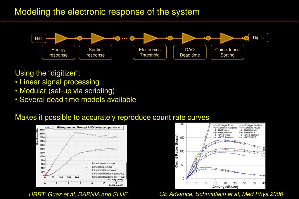 Digi’s Hits Electronics Threshold Energyresponse Spatialresponse DAQ Dead time Coincidence Sorting GE Advance, Schmidtlein et al, Med Phys 2006 HRRT, Guez et al, DAPNIA and SHJF Modeling the electronic response of the system • Using the “digitizer”: • Linear signal processing • Modular (set-up via scripting) • Several dead time models available • Makes it possible to accurately reproduce count rate curves