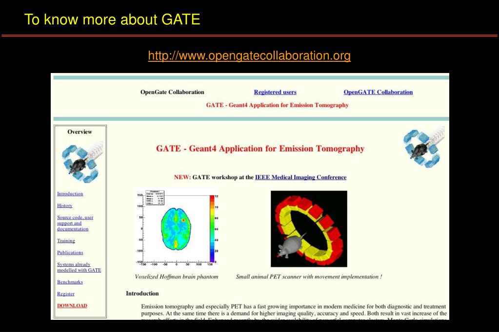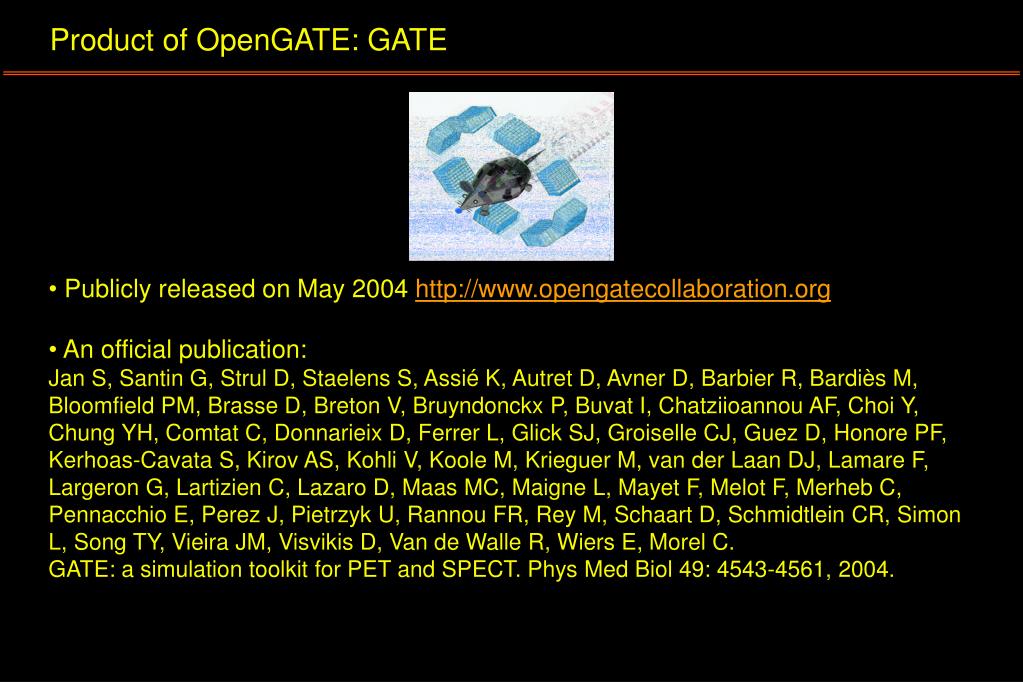 Product of OpenGATE: GATE • Publicly released on May 2004 http://www.opengatecollaboration.org • An official publication: • Jan S, Santin G, Strul D, Staelens S, Assié K, Autret D, Avner D, Barbier R, Bardiès M, Bloomfield PM, Brasse D, Breton V, Bruyndonckx P, Buvat I, Chatziioannou AF, Choi Y, Chung YH, Comtat C, Donnarieix D, Ferrer L, Glick SJ, Groiselle CJ, Guez D, Honore PF, Kerhoas-Cavata S, Kirov AS, Kohli V, Koole M, Krieguer M, van der Laan DJ, Lamare F, Largeron G, Lartizien C, Lazaro D, Maas MC, Maigne L, Mayet F, Melot F, Merheb C, Pennacchio E, Perez J, Pietrzyk U, Rannou FR, Rey M, Schaart D, Schmidtlein CR, Simon L, Song TY, Vieira JM, Visvikis D, Van de Walle R, Wiers E, Morel C. GATE: a simulation toolkit for PET and SPECT. Phys Med Biol 49: 4543-4561, 2004.