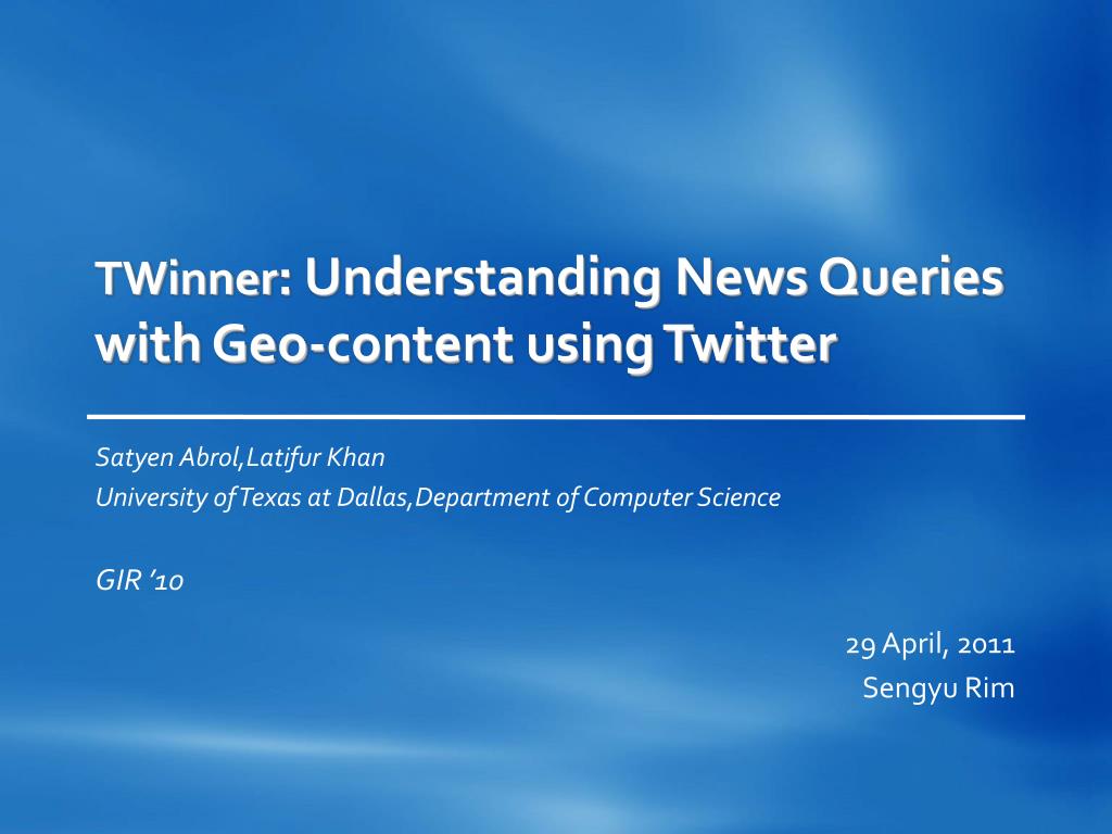 TWinner: Understanding News Queries with Geo-content using Twitter Satyen Abrol,Latifur Khan University of Texas at Dallas,Department of Computer Science GIR ’10 29 April, 2011 SengyuRim