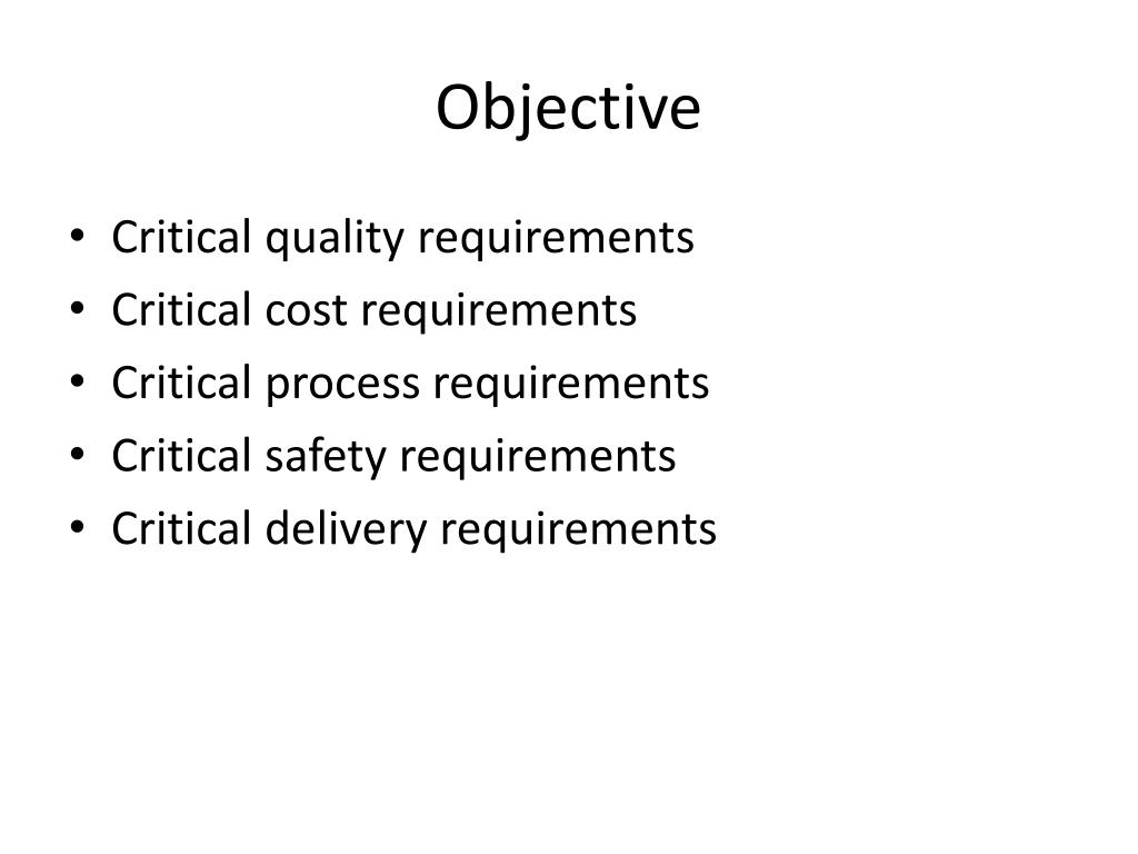 Objective • Critical quality requirements • Critical cost requirements • Critical process requirements • Critical safety requirements • Critical delivery requirements