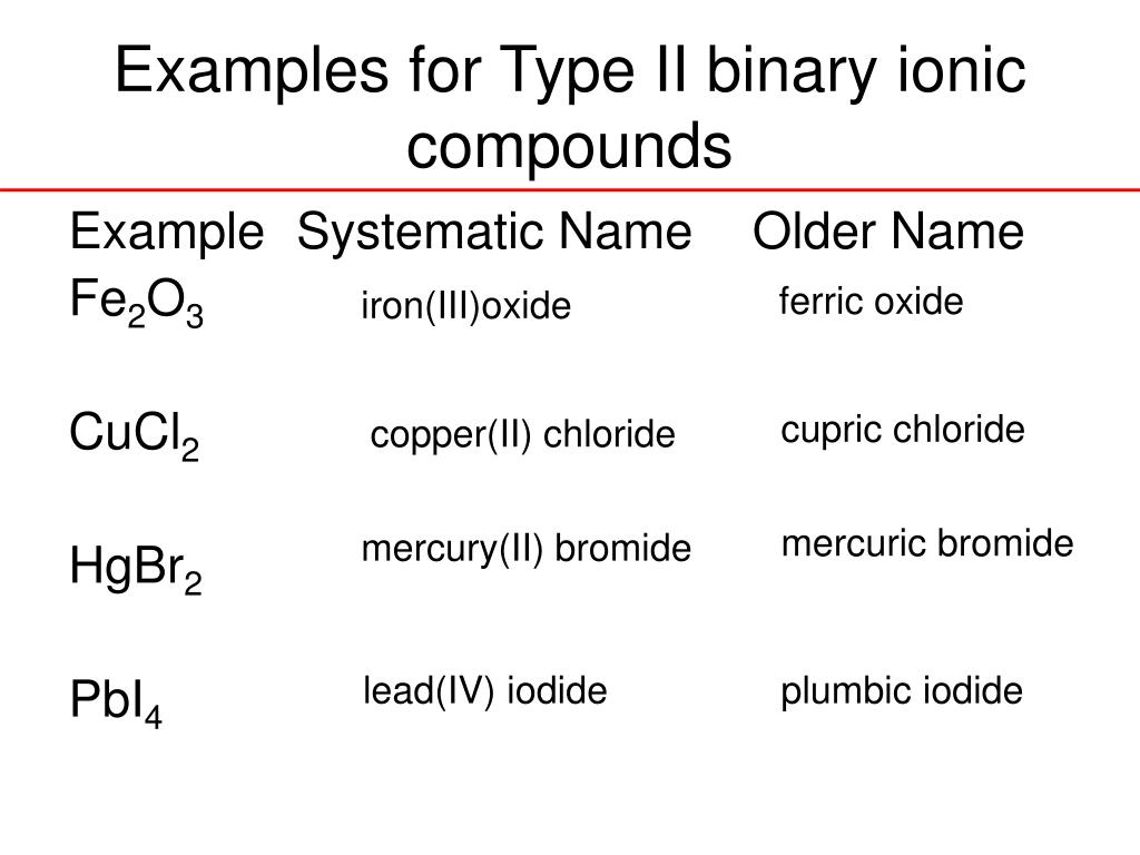 Examples for Type II binary ionic compounds Example Systematic Name Older Name Fe2O3 CuCl2 HgBr2 PbI4 ferric oxide iron(III)oxide cupric chloride copper(II) chloride mercuric bromide mercury(II) bromide lead(IV) iodide plumbic iodide