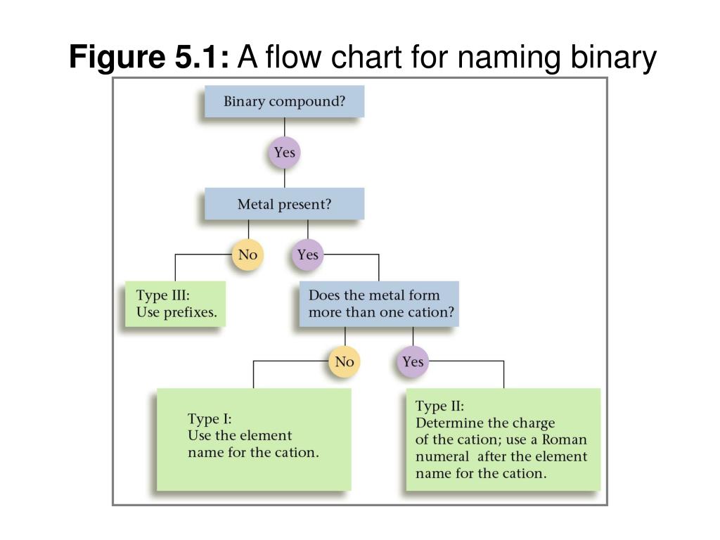 Binary compounds • TWO BROAD CLASSES • Compounds that contain a metal and a nonmetal (Type I and Type II) • Compounds that contain 2 nonmetals (Type III)