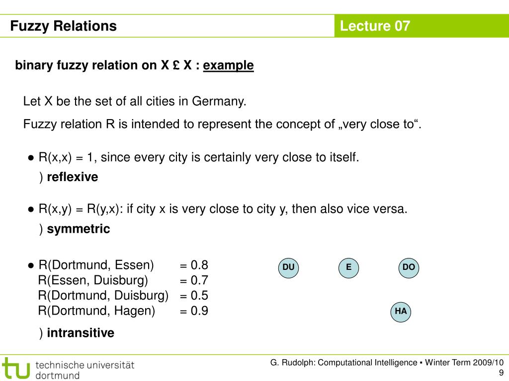 Plan for Today • Fuzzy relations • Fuzzy logic • Linguistic variables and terms • Inference from fuzzy statements G. Rudolph: Computational Intelligence ▪ Winter Term 2009/10 2