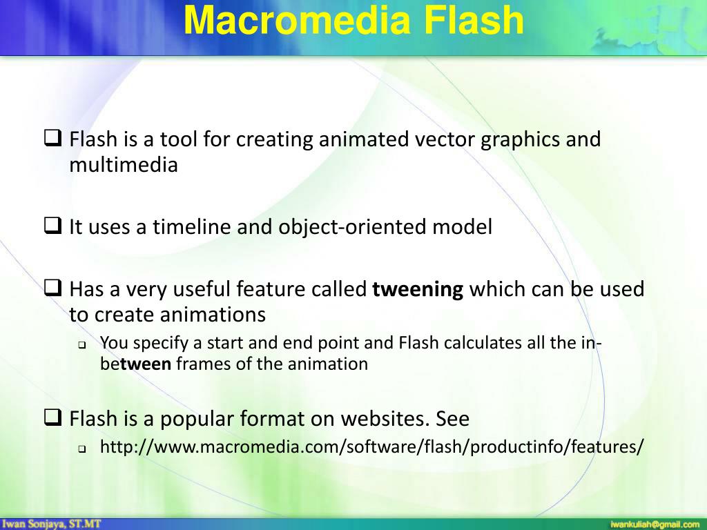 Macromedia Flash • Flash is a tool for creating animated vector graphics and multimedia • It uses a timeline and object-oriented model • Has a very useful feature called tweening which can be used to create animations • You specify a start and end point and Flash calculates all the in-between frames of the animation • Flash is a popular format on websites. See • http://www.macromedia.com/software/flash/productinfo/features/