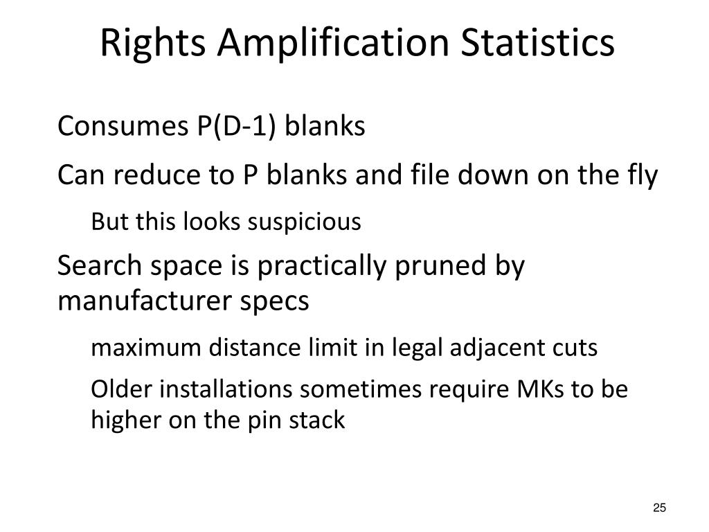 Rights Amplification Statistics • Consumes P(D-1) blanks • Can reduce to P blanks and file down on the fly • But this looks suspicious • Search space is practically pruned by manufacturer specs • maximum distance limit in legal adjacent cuts • Older installations sometimes require MKs to be higher on the pin stack
