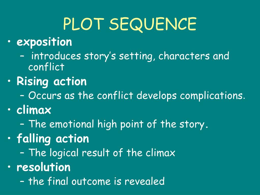 PLOT SEQUENCE • exposition • introduces story’s setting, characters and conflict • Rising action • Occurs as the conflict develops complications. • climax • The emotional high point of the story. • falling action • The logical result of the climax • resolution • the final outcome is revealed