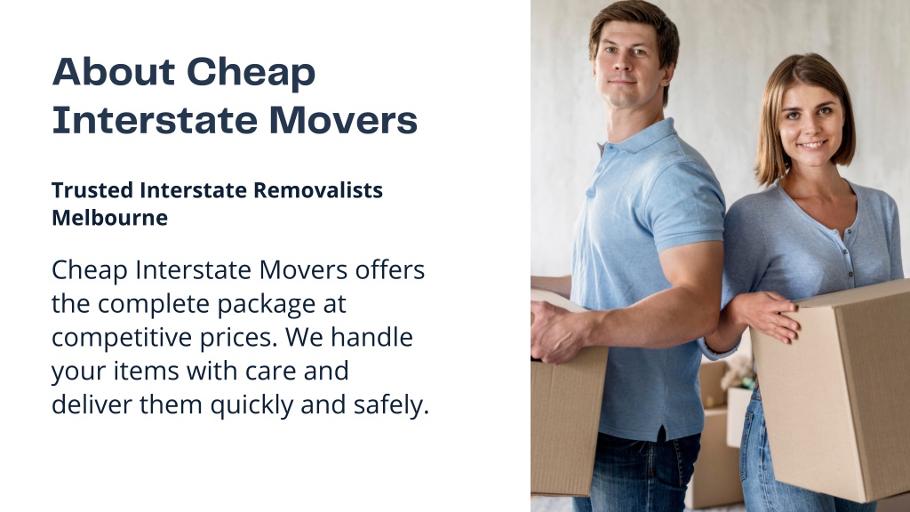 About Cheap Interstate Movers Trusted Interstate Removalists Melbourne Cheap Interstate Movers offers the complete package at competitive prices. We handle your items with care and deliver them quickly and safely.