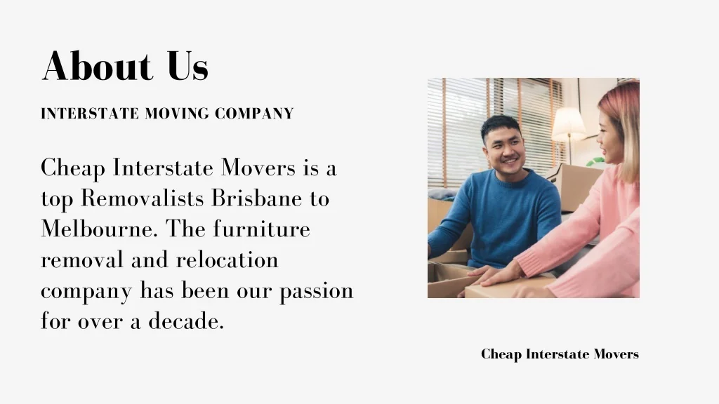 02 About Us INTERSTATE MOVING COMPANY Cheap Interstate Movers is a top Removalists Brisbane to Melbourne. The furniture removal and relocation company has been our passion for over a decade. Cheap Interstate Movers