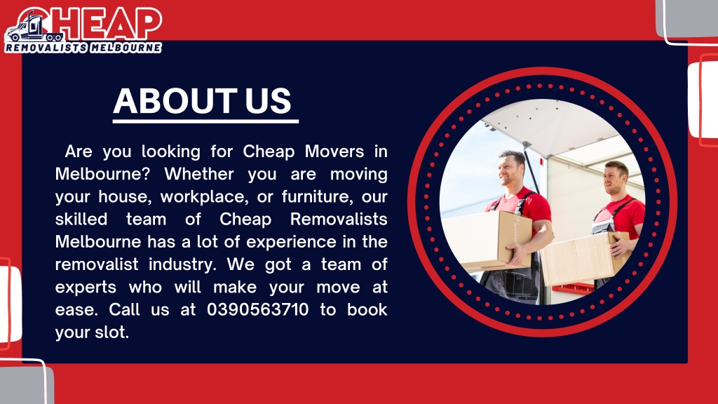 ABOUT US Are you looking for Cheap Movers in Melbourne? Whether you are moving your house, workplace, or furniture, our skilled team of Cheap Removalists Melbourne has a lot of experience in the removalist industry. We got a team of experts who will make your move at ease. Call us at 0390563710 to book your slot.