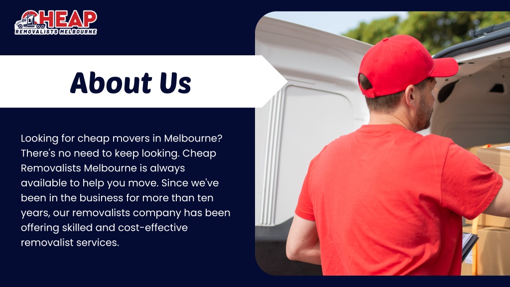 About Us Looking for cheap movers in Melbourne? There's no need to keep looking. Cheap Removalists Melbourne is always available to help you move. Since we've been in the business for more than ten years, our removalists company has been offering skilled and cost-effective removalist services.