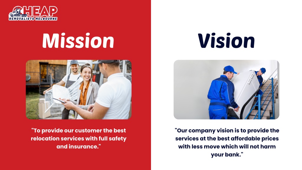 Vision Mission "To provide our customer the best relocation services with full safety and insurance." "Our company vision is to provide the services at the best affordable prices with less move which will not harm your bank."