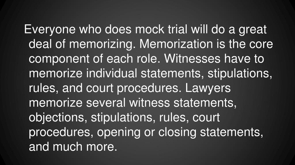Everyone who does mock trial will do a great deal of memorizing. Memorization is the core component of each role. Witnesses have to memorize individual statements, stipulations, rules, and court procedures. Lawyers memorize several witness statements, objections, stipulations, rules, court procedures, opening or closing statements, and much more.