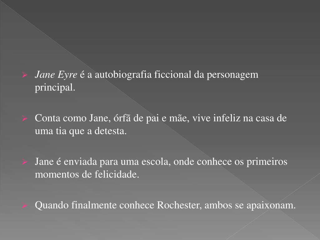 Jane Eyre é a autobiografia ficcional da personagem principal. • Conta como Jane, órfã de pai e mãe, vive infeliz na casa de uma tia que a detesta. • Jane é enviada para uma escola, onde conhece os primeiros momentos de felicidade. • Quando finalmente conhece Rochester, ambos se apaixonam.