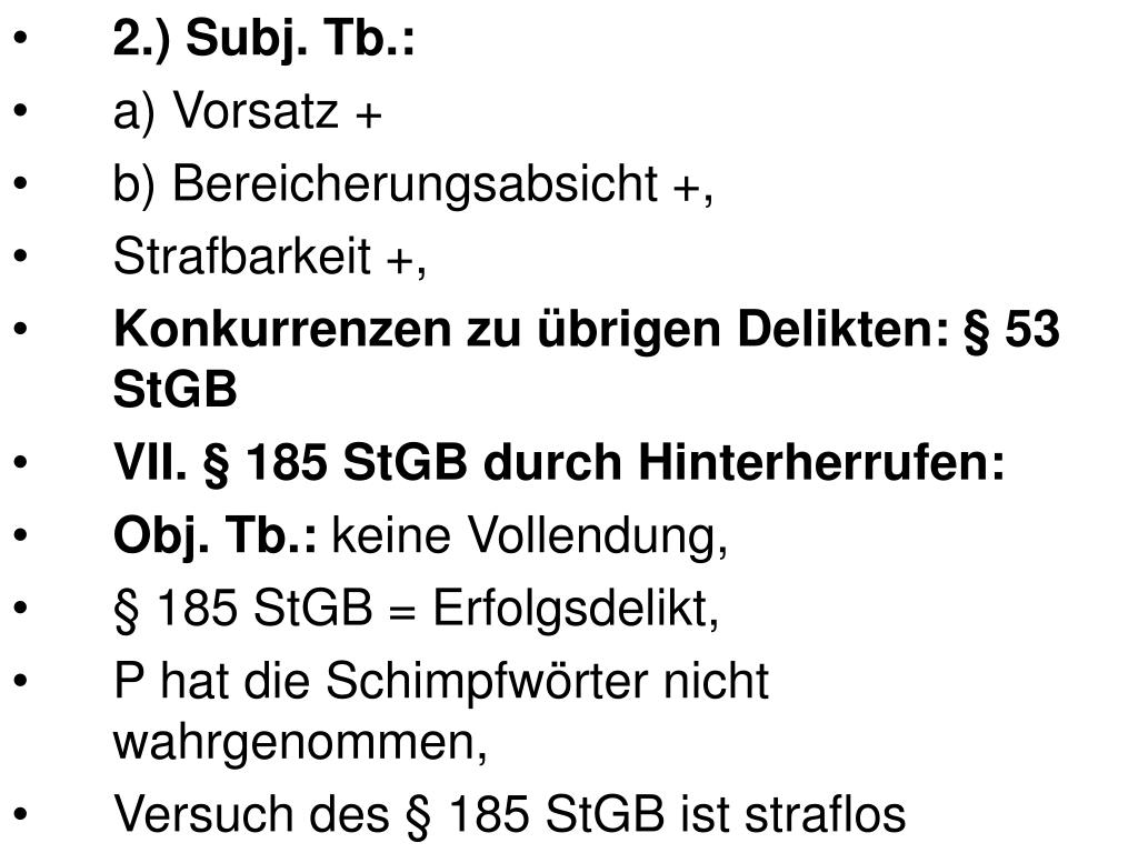 2.) Subj. Tb.: a) Vorsatz + b) Bereicherungsabsicht +, Strafbarkeit +, Konkurrenzen zu übrigen Delikten: § 53 StGB VII. § 185 StGB durch Hinterherrufen: Obj. Tb.: keine Vollendung, § 185 StGB = Erfolgsdelikt, P hat die Schimpfwörter nicht wahrgenommen, Versuch des § 185 StGB ist straflos