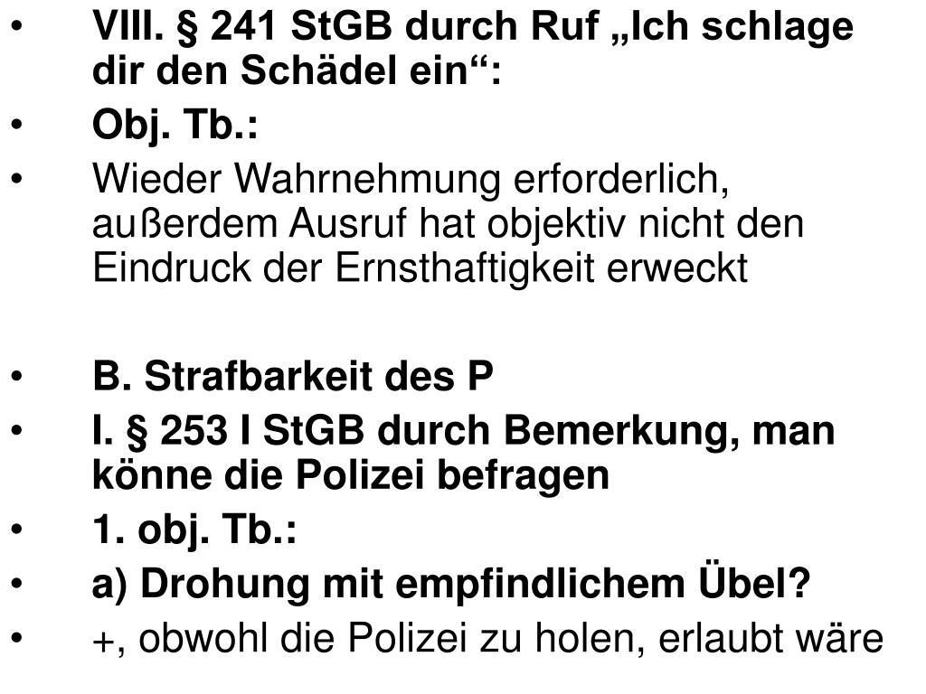 VIII. § 241 StGB durch Ruf „Ich schlage dir den Schädel ein“: Obj. Tb.: Wieder Wahrnehmung erforderlich, außerdem Ausruf hat objektiv nicht den Eindruck der Ernsthaftigkeit erweckt B. Strafbarkeit des P I. § 253 I StGB durch Bemerkung, man könne die Polizei befragen 1. obj. Tb.: a) Drohung mit empfindlichem Übel? +, obwohl die Polizei zu holen, erlaubt wäre