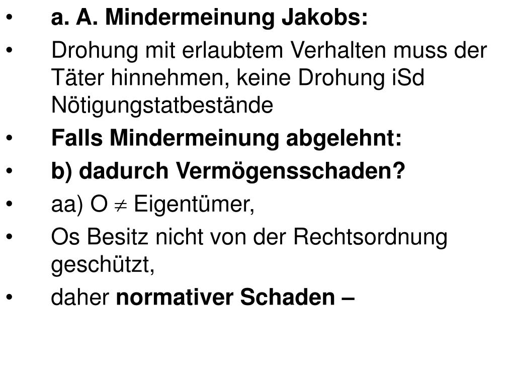 a. A. Mindermeinung Jakobs: Drohung mit erlaubtem Verhalten muss der Täter hinnehmen, keine Drohung iSd Nötigungstatbestände Falls Mindermeinung abgelehnt: b) dadurch Vermögensschaden? aa) O ¹ Eigentümer, Os Besitz nicht von der Rechtsordnung geschützt, daher normativer Schaden –