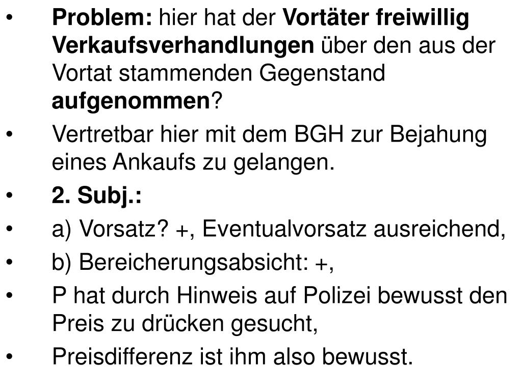Problem: hier hat der Vortäterfreiwillig Verkaufsverhandlungen über den aus der Vortat stammenden Gegenstand aufgenommen? Vertretbar hier mit dem BGH zur Bejahung eines Ankaufs zu gelangen. 2. Subj.: a) Vorsatz? +, Eventualvorsatz ausreichend, b) Bereicherungsabsicht: +, P hat durch Hinweis auf Polizei bewusst den Preis zu drücken gesucht, Preisdifferenz ist ihm also bewusst.