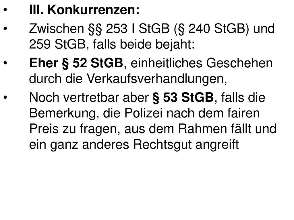 III. Konkurrenzen: Zwischen §§ 253 I StGB (§ 240 StGB) und 259 StGB, falls beide bejaht: Eher § 52 StGB, einheitliches Geschehen durch die Verkaufsverhandlungen, Noch vertretbar aber § 53 StGB, falls die Bemerkung, die Polizei nach dem fairen Preis zu fragen, aus dem Rahmen fällt und ein ganz anderes Rechtsgut angreift